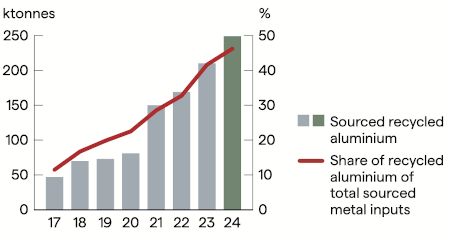 The share of sourced recycled aluminium increased by 4.6 percentage points to 46.2 percent (41.6) The volume of sourced recycled aluminium increased by 19 percent to 249 ktonnes (210), which corresponds to 5.3x the volume in 2017. |