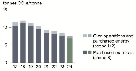 Scope 1+2 intensity decreased by 2 percent to 0.64 tonnes CO2e/tonne (0.66) and scope 3 decreased by 11 percent to 6.9 (7.7). Total carbon emissions intensity (scope 1+2+3) has been reduced by 35 percent versus baseline 2017. |