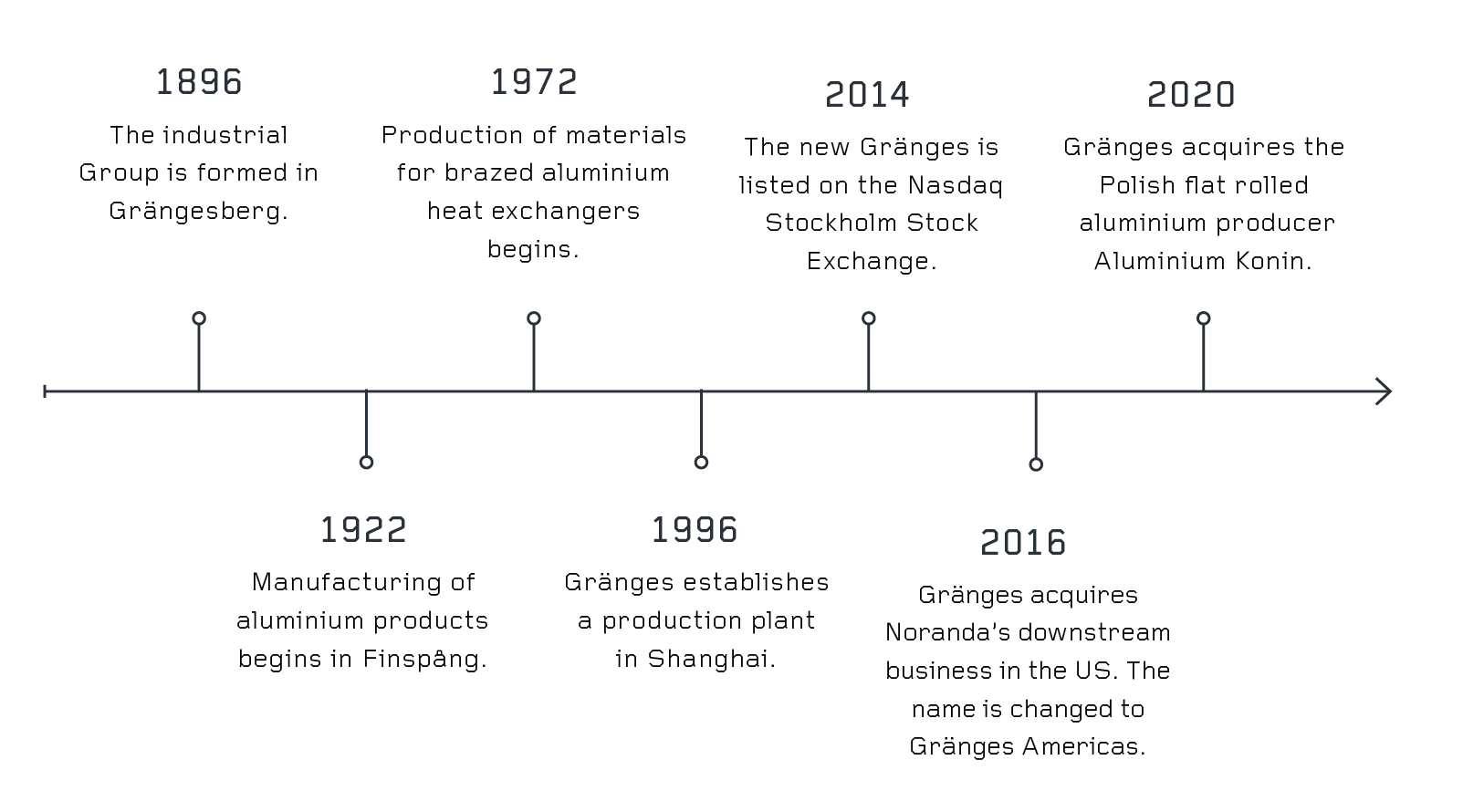 The foundation of our business was laid in 1896 in Grängesberg, Sweden. Thereafter, several different industrial enterprises became part of the Group, including Grängesberg mines, the TGOJ rail business, Oxelösund ironworks, and a shipping business. In 1969, the Group acquired Svenska Metallverken, which included an aluminium products business, an operation that would later evolve into Gränges. Our production of aluminum products began in 1922 and already in 1972 we began with production of aluminium heat exchanger strips in Finspång.