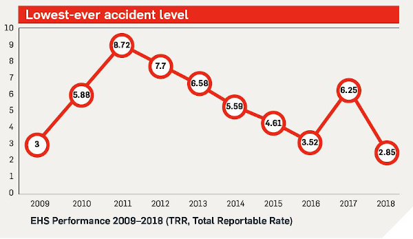 Between 2017 and 2018 a cross functional team led by Ge Sun, Vice President for EHS & Quality, succeeded in reducing the Total Reportable Rate (TRR) of accidents per million hours worked from 6.25 to just 2.85, the plant’s lowest level in ten years. Sun takes up the story: