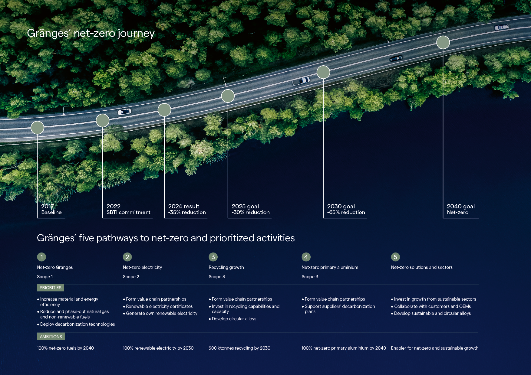 In 2024, Gränges has developed regional 2030 decarbonization plans, consolidated into a group-wide net-zero plan with five key pathways to reduce carbon emissions; Net-zero Gränges, Net-zero electricity, Recycling growth, Net-zero primary aluminium and Net-zero solutions and sectors.