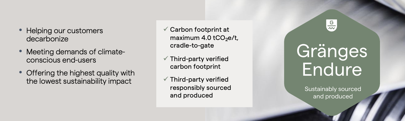 Gränges Endure kommer att hjälpa kunderna att minska koldioxidutsläppen från sina produkter och uppfylla kraven från miljömedvetna slutanvändare. Gränges Endure har den lägsta miljöpåverkan och erbjuder samtidigt högsta kvalitet. Gränges Endure-produkterna har externt verifierade koldioxidutsläpp på högst 4,0 ton CO2e/ton, mätt från bauxitutvinningen till dess att Gränges produkter levereras till kunderna (vagga till grind). Det görs också en verifiering av en extern part att produkterna har ansvarsfullt inköpta råvaror och är ansvarsfullt producerade.