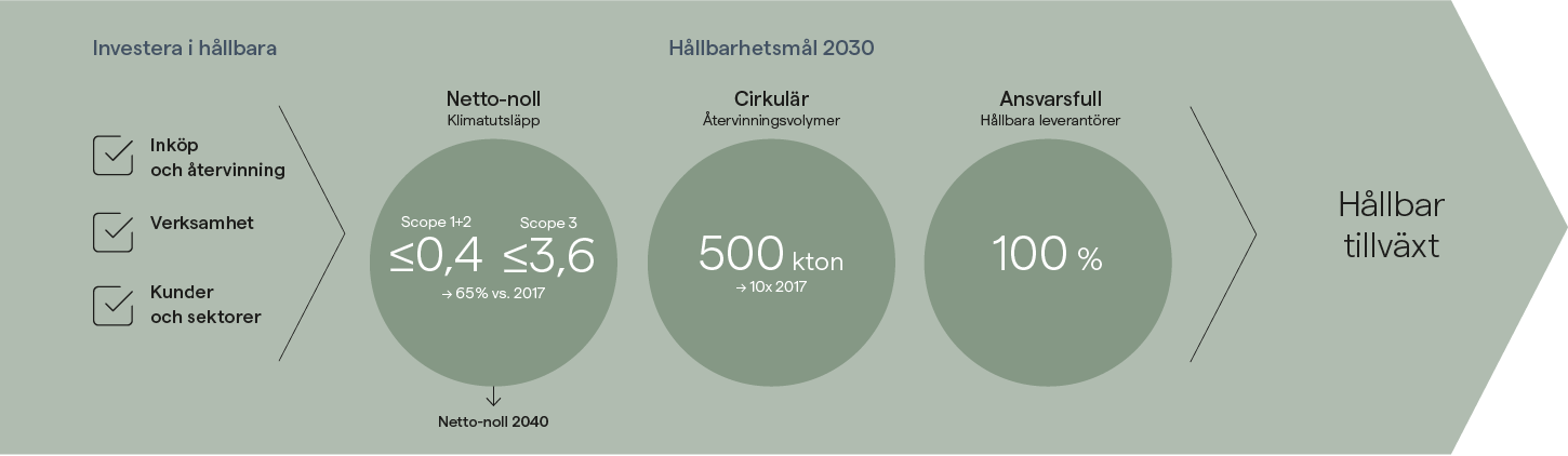 Gränges investerar i cirkulära affärsmodeller, slutna partnerskap, återvinningskapacitet och utveckling av cirkulära legeringar för att öka användningen av återvunnet material i sina produkter. Gränges siktar på att nå en total återvinningsvolym på 500 kton till 2030, vilket motsvarar 10 gånger volymen under basåret 2017.