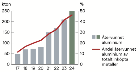 Andelen inköpt återvunnet aluminium ökade med 4,6 procentenheter till 46,2 procent (41,6). Volymen inköpt återvunnet aluminium ökade med 19 procent till 249 kton (210), vilket motsvarar 5,3x volymen 2017. |