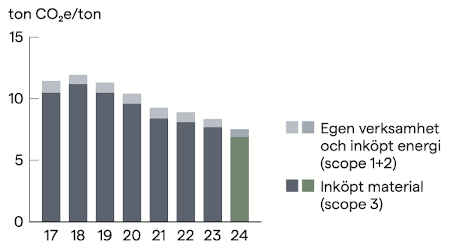 Klimatutsläppen per ton minskade med 2 procent till 0,64 ton CO2e/ton (0,66) för scope 1+2 och med 11 procent till 6,9 ton CO2e/ton (7,7) för scope 3. De totala klimatutsläppen per ton (scope 1+2+3) har minskat med 35 procent jämfört med basåret 2017. |
